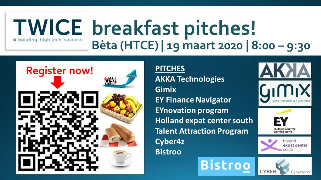 On March 19th we will again organize our Breakfast pitches at the HTCE in the Twice building. An inspiring session for and by all startup and scaleup companies at HTCE.